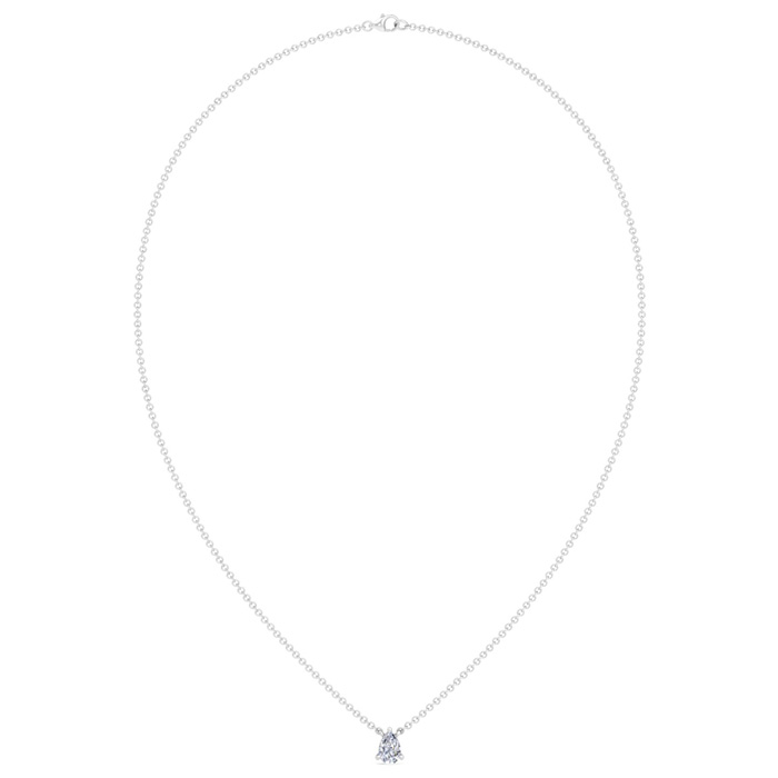 This lab grown diamond necklace features one pear shape lab grown diamond in G-H color, VS2 clarity weighing approximately 1/2 carat. This necklace is in Sterling Silver and has an 18 inch cable chain with a spring-ring clasp.