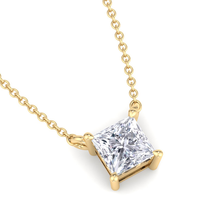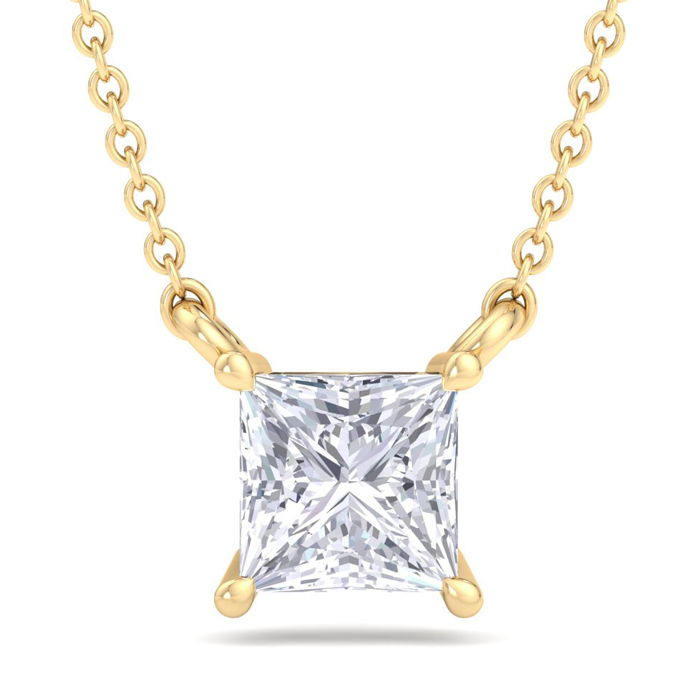 This lab grown diamond necklace features one princess cut lab grown diamond in G-H color, VS2 clarity weighing approximately 1/2 carat. This necklace is in 14K Yellow Gold Over Sterling Silver and has an 18 inch cable chain with a spring-ring clasp.