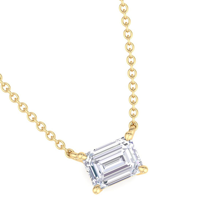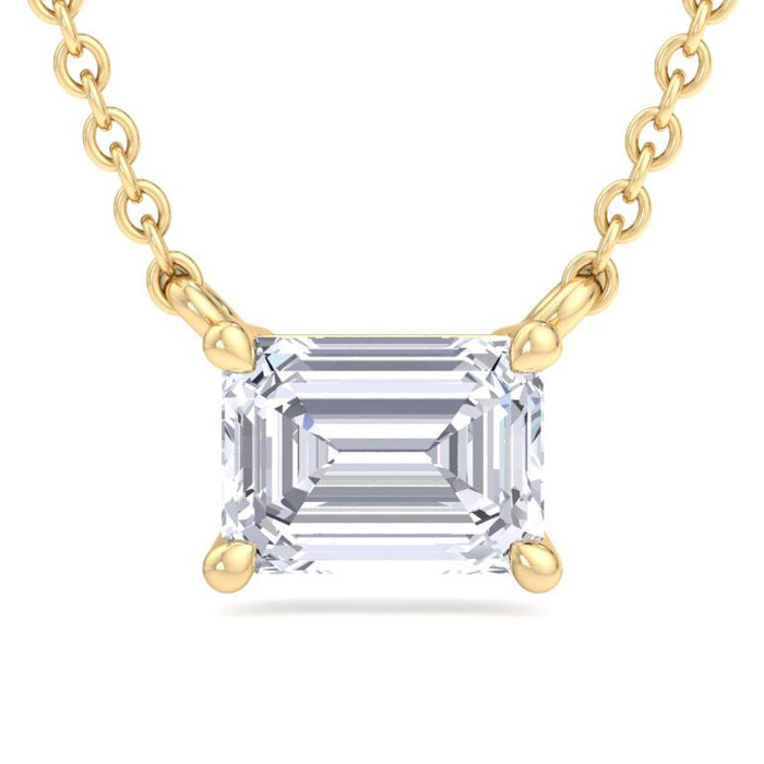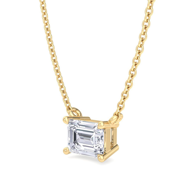 This lab grown diamond necklace features one emerald cut lab grown diamond in G-H color, VS2 clarity weighing approximately 1/3 carat. This necklace is in 14K Yellow Gold Over Sterling Silver and has an 18 inch cable chain with a spring-ring clasp.