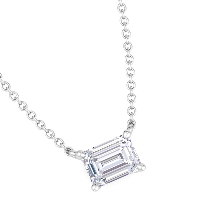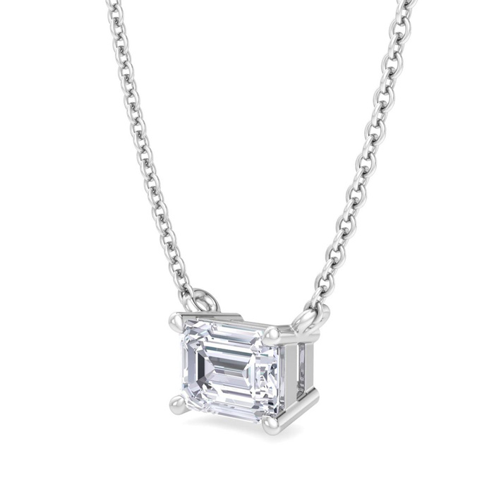 This lab grown diamond necklace features one emerald cut lab grown diamond in G-H color, VS2 clarity weighing approximately 1/3 carat. This necklace is in Sterling Silver and has an 18 inch cable chain with a spring-ring clasp.