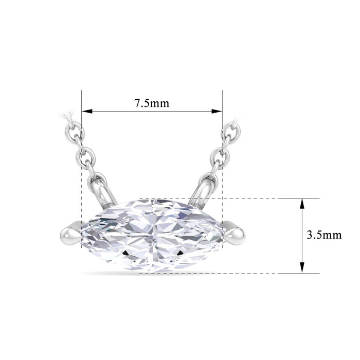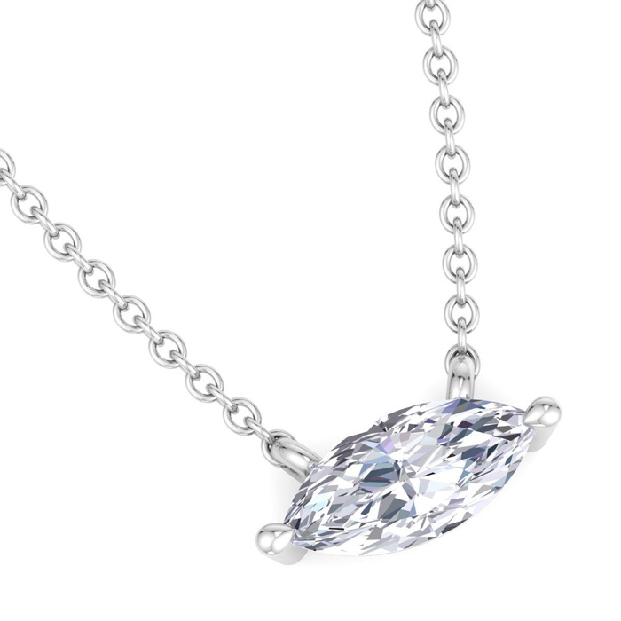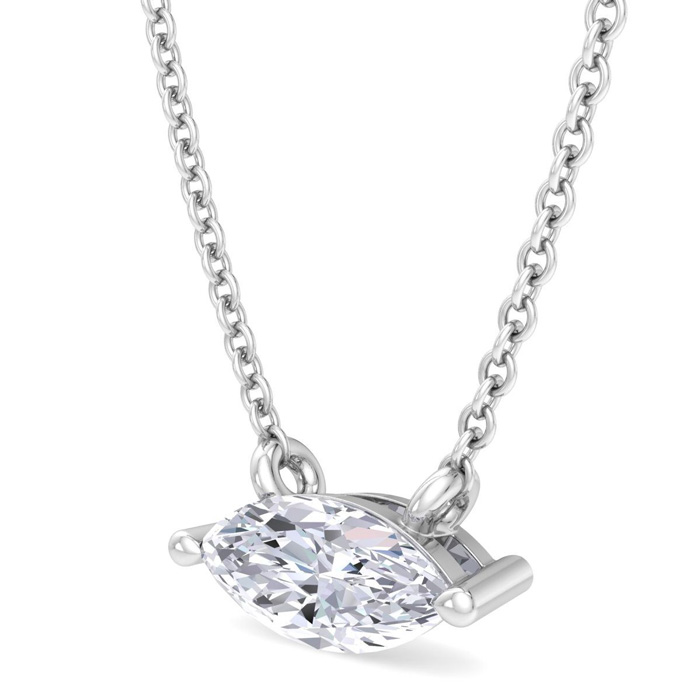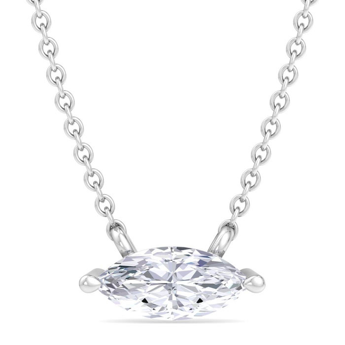 This lab grown diamond necklace features one marquise shape lab grown diamond in G-H color, VS2 clarity weighing approximately 1/3 carat. This necklace is in Sterling Silver and has an 18 inch cable chain with a spring-ring clasp.