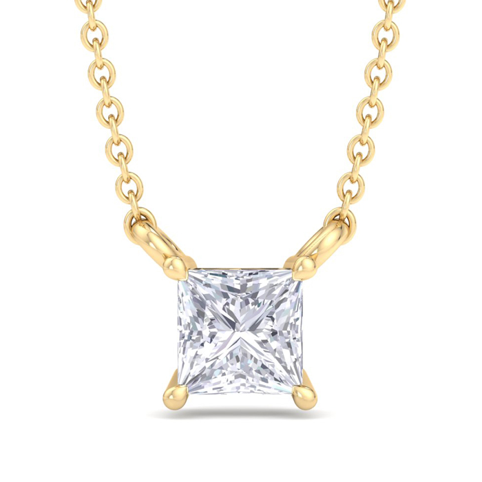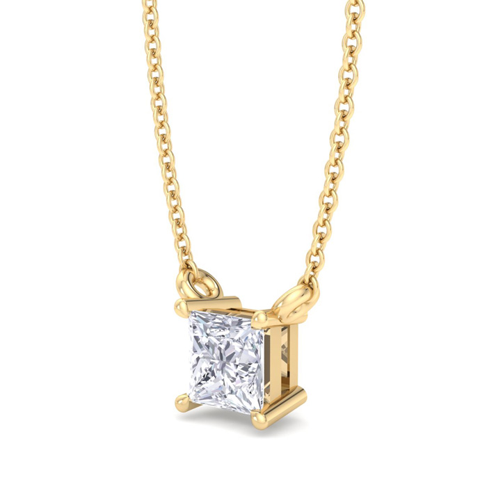 This lab grown diamond necklace features one princess cut lab grown diamond in G-H color, VS2 clarity weighing approximately 1/3 carat. This necklace is in 14K Yellow Gold Over Sterling Silver and has an 18 inch cable chain with a spring-ring clasp.