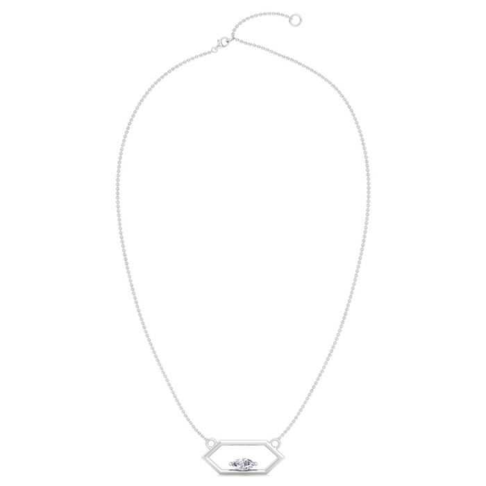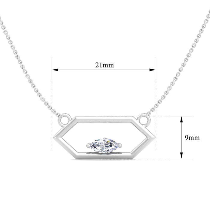 This lab grown diamond necklace features a 1/4 carat marquise shape center lab grown diamond in G-H color, VS clarity. This necklace is in 14 karat white gold and comes with an 18 inch cable chain with a spring-ring clasp. The pendant is 3/4 inch.