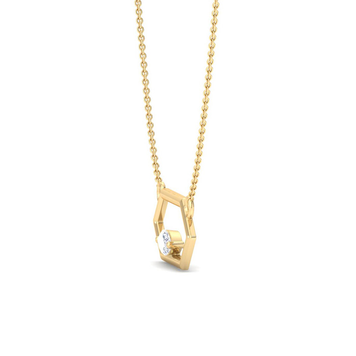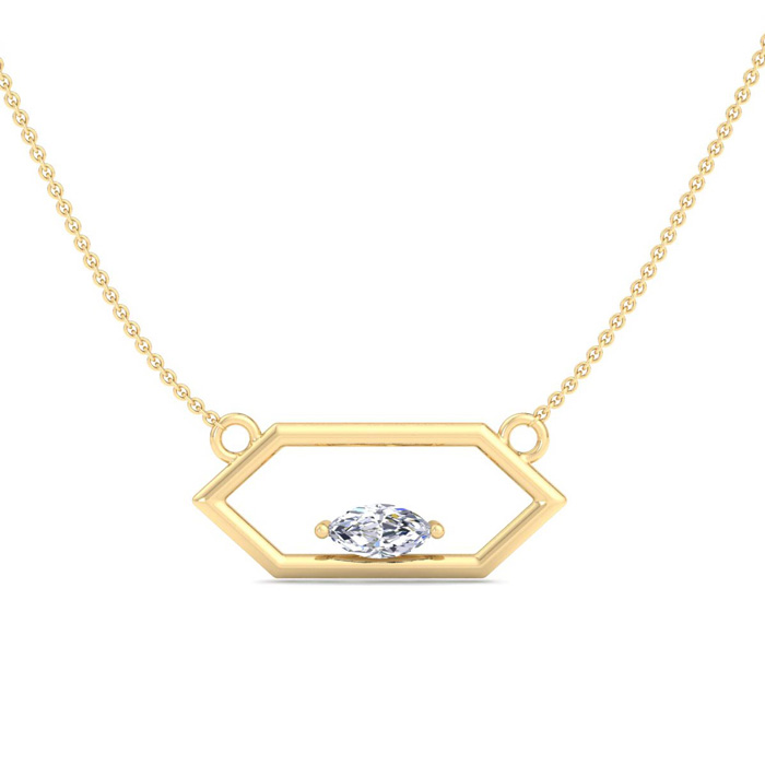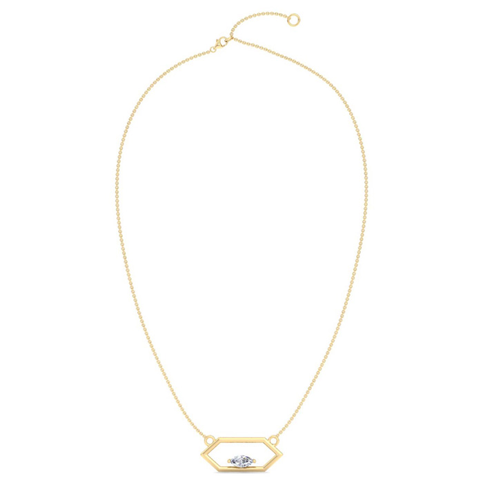 This lab grown diamond necklace features a 1/4 carat marquise shape center lab grown diamond in G-H color, VS clarity. This necklace is in 14 karat yellow gold and comes with an 18 inch cable chain with a spring-ring clasp. The pendant is 3/4 inch.