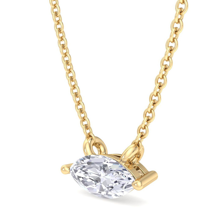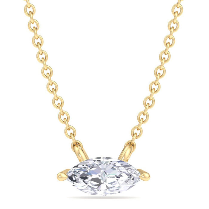 This lab grown diamond necklace features one marquise shape lab grown diamond in G-H color, VS2 clarity weighing approximately 1/4 carat. This necklace is in 14K Yellow Gold Over Sterling Silver and has an 18 inch cable chain with a spring-ring clasp.