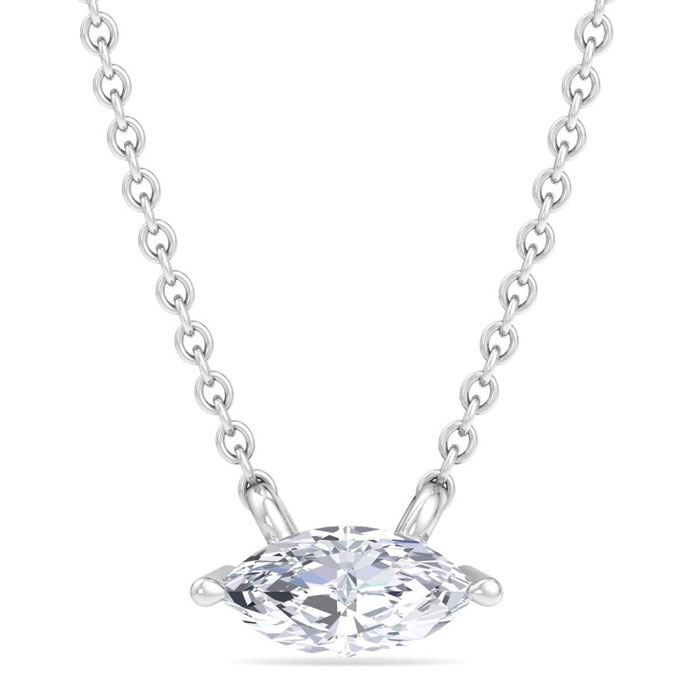This lab grown diamond necklace features one marquise shape lab grown diamond in G-H color, VS2 clarity weighing approximately 1/4 carat. This necklace is in Sterling Silver and has an 18 inch cable chain with a spring-ring clasp.