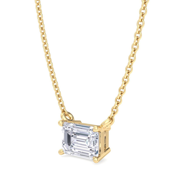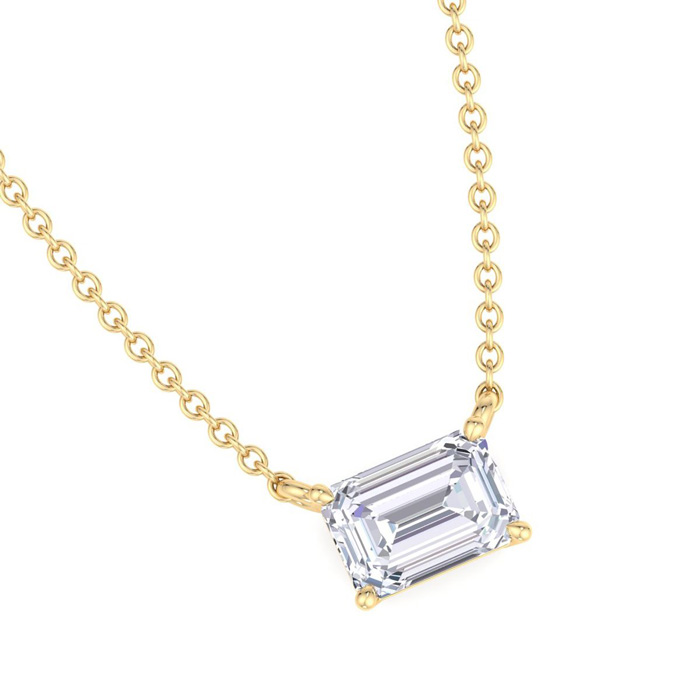 This lab grown diamond necklace features one emerald cut lab grown diamond in G-H color, VS2 clarity weighing approximately 1 carat. This necklace is in 14K Yellow Gold Over Sterling Silver and has an 18 inch cable chain with a spring-ring clasp.
