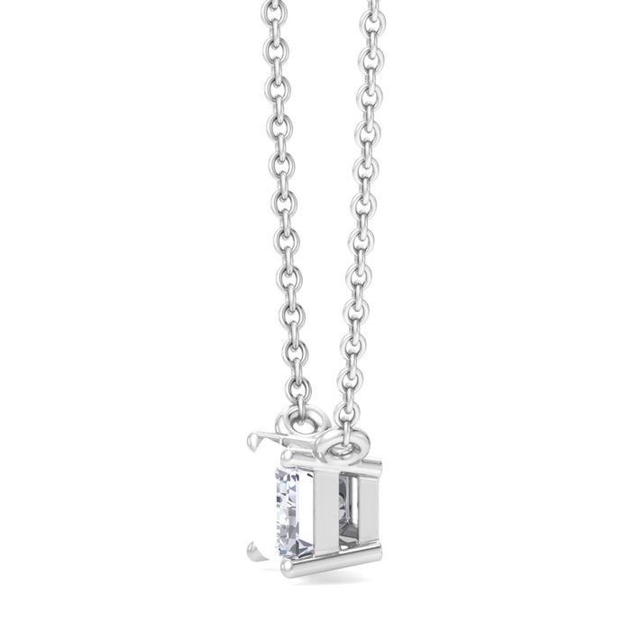 This lab grown diamond necklace features one emerald cut lab grown diamond in G-H color, VS2 clarity weighing approximately 1 carat. This necklace is in Sterling Silver and has an 18 inch cable chain with a spring-ring clasp.