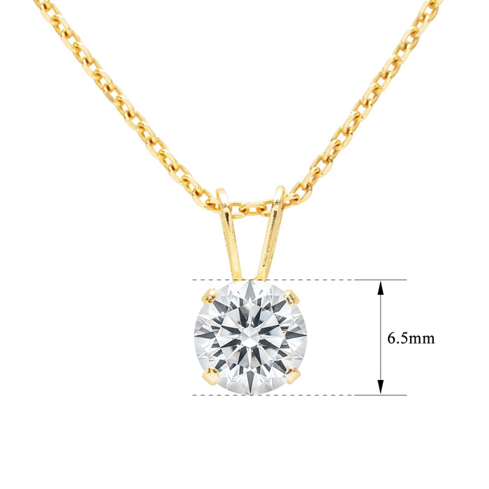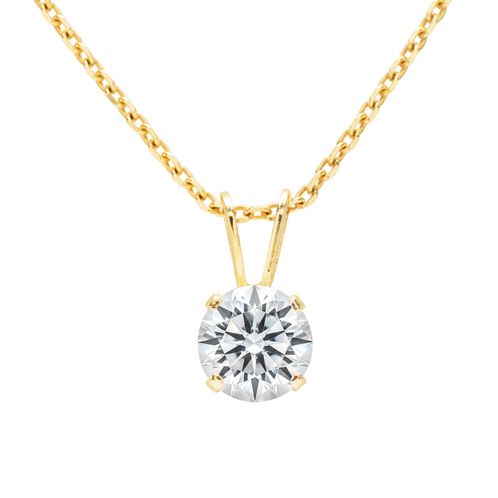 This amazing lab grown diamond necklace features one lab grown diamond totaling 1 carat. The lab grown diamond is in G-H color, VS clarity. This necklace is crafted in 14 karat yellow gold filled metal and comes with a free 18 inch, yellow gold over sterling silver cable chain with spring-ring clasp.