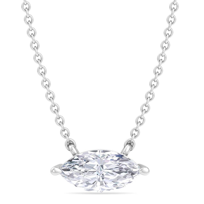 This lab grown diamond necklace features one marquise shape lab grown diamond in G-H color, VS2 clarity weighing approximately 1 carat. This necklace is in 14 karat white gold and has an 18 inch cable chain with a spring-ring clasp.