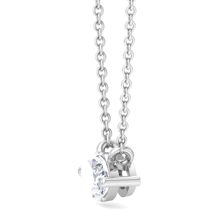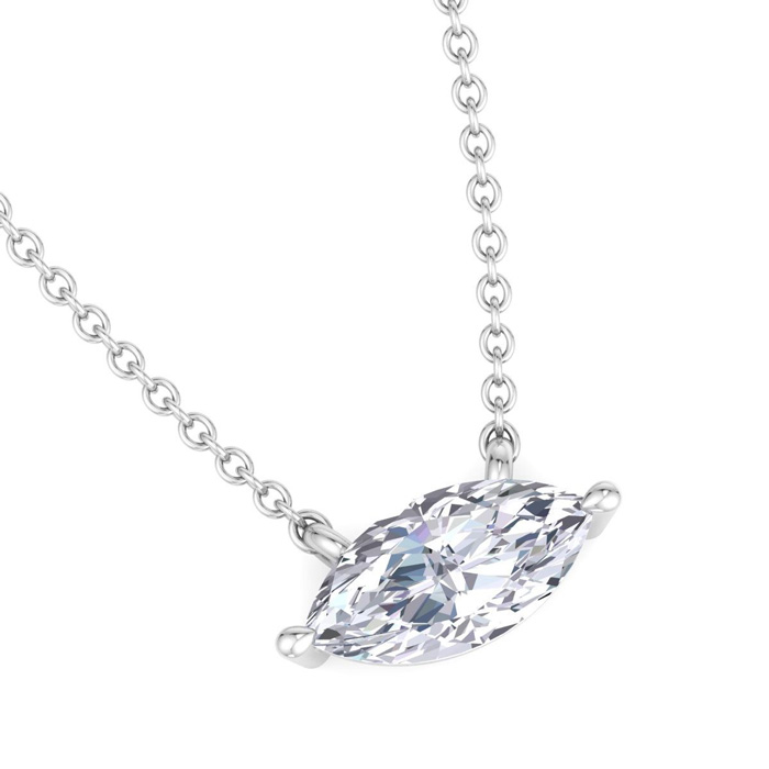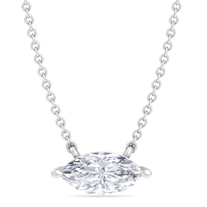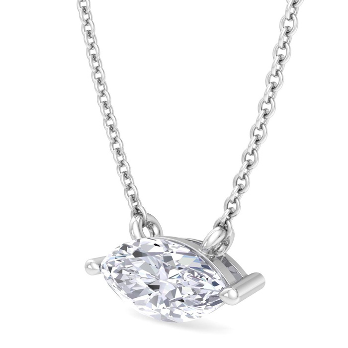 This lab grown diamond necklace features one marquise shape lab grown diamond in G-H color, VS2 clarity weighing approximately 1 carat. This necklace is in Sterling Silver and has an 18 inch cable chain with a spring-ring clasp.