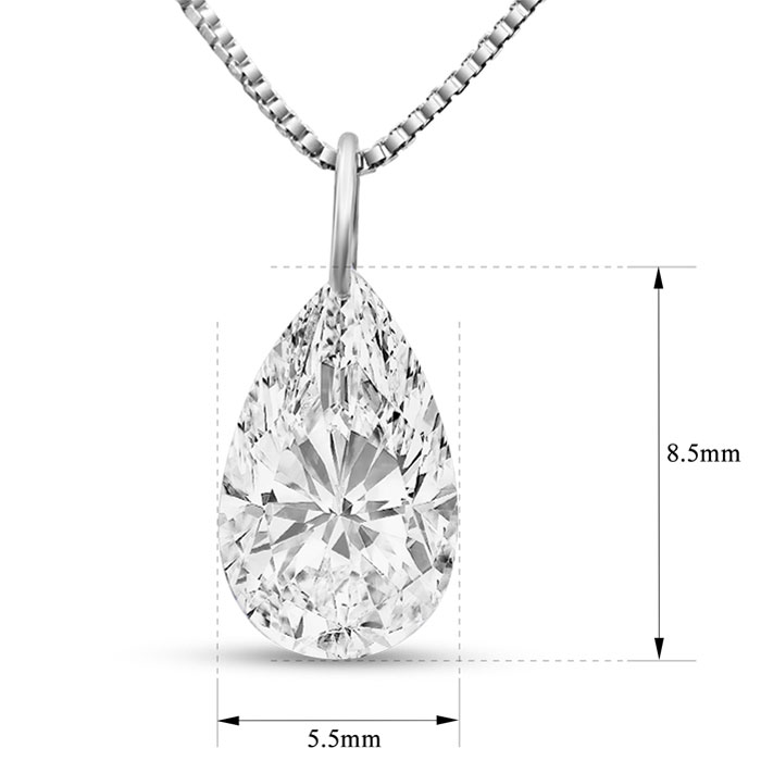 This amazing lab grown diamond necklace features one 8.5x5.5mm pear shape lab grown diamond. Lab grown diamond color is G-H, diamond clarity is VS. Total carat weight is approximately 1 carat. This pendant comes with a 14 karat white gold box chain with a spring-ring clasp.
