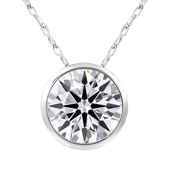 This lab grown diamond necklace features a 1 carat round shape center lab grown diamond in a bezel setting in G-H color, VS clarity. This necklace is in 14 karat white gold and comes with an 18 inch cable chain with a spring-ring clasp.