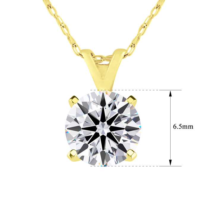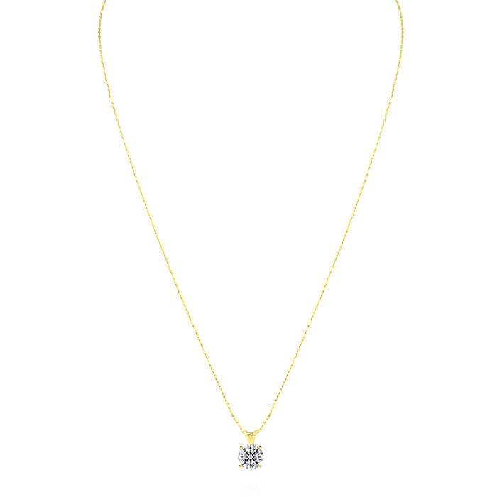 This lab grown diamond necklace features a 1 carat round shape center lab grown diamond in G-H color, VS clarity. This necklace is in 14 karat yellow gold and comes with an 18 inch cable chain with a spring-ring clasp.
