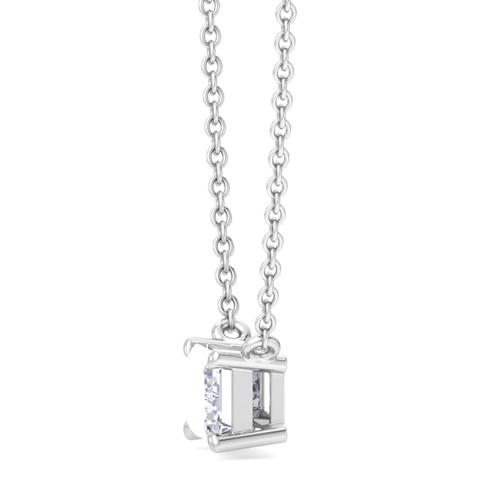 This lab grown diamond necklace features one emerald cut lab grown diamond in G-H color, VS2 clarity weighing approximately 2 carats. This necklace is in Sterling Silver and has an 18 inch cable chain with a spring-ring clasp.