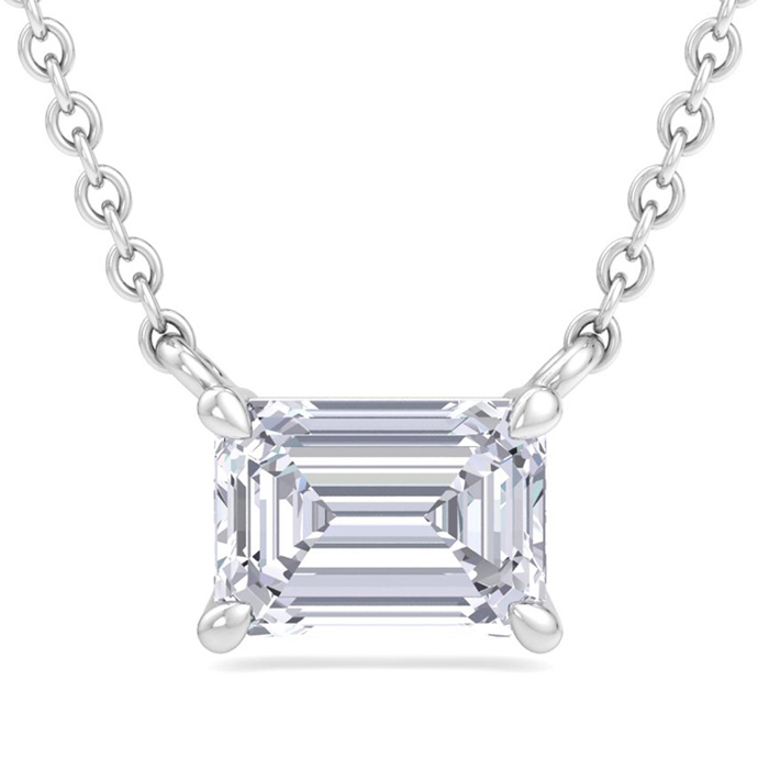 This lab grown diamond necklace features one emerald cut lab grown diamond in G-H color, VS2 clarity weighing approximately 4 carats. This necklace is in 14 karat white gold and has an 18 inch cable chain with a spring-ring clasp.