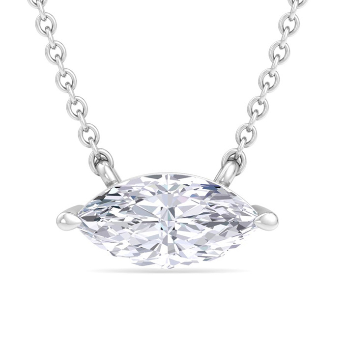 This lab grown diamond necklace features one marquise shape lab grown diamond in G-H color, VS2 clarity weighing approximately 4 carats. This necklace is in 14 karat white gold and has an 18 inch cable chain with a spring-ring clasp.