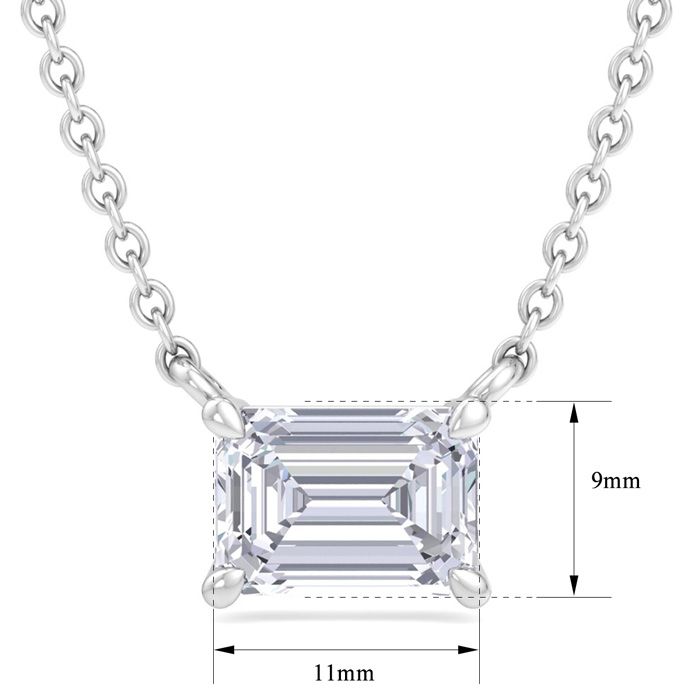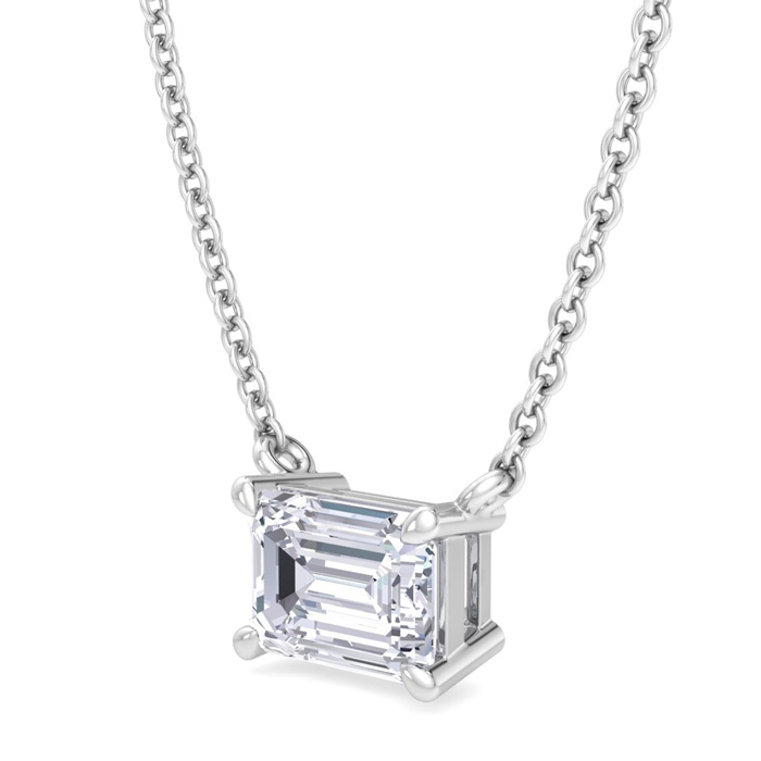 This lab grown diamond necklace features one emerald cut lab grown diamond in G-H color, VS2 clarity weighing approximately 5 carats. This necklace is in 14 karat white gold and has an 18 inch cable chain with a spring-ring clasp.
