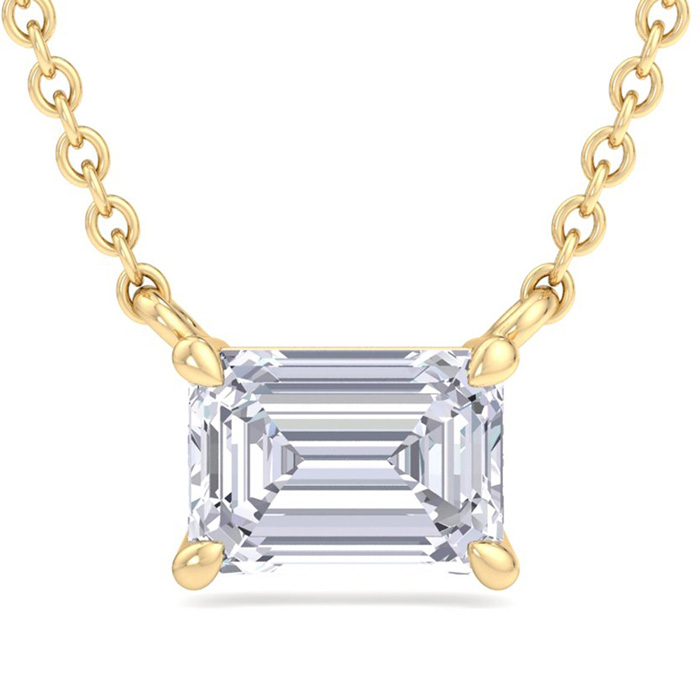 This lab grown diamond necklace features one emerald cut lab grown diamond in G-H color, VS2 clarity weighing approximately 5 carats. This necklace is in 14 karat yellow gold and has an 18 inch cable chain with a spring-ring clasp.