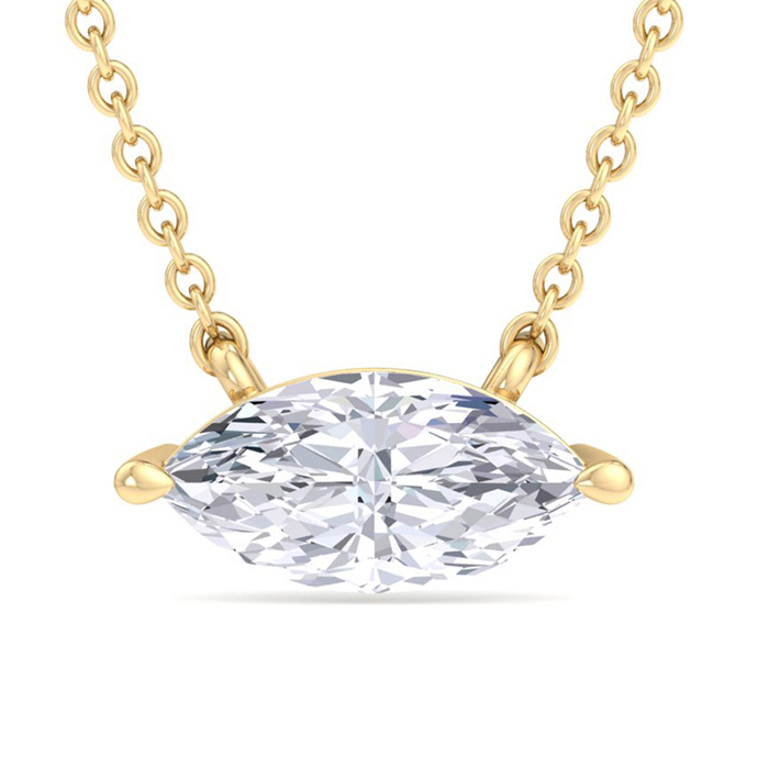 This lab grown diamond necklace features one marquise shape lab grown diamond in G-H color, VS2 clarity weighing approximately 5 carats. This necklace is in 14 karat yellow gold and has an 18 inch cable chain with a spring-ring clasp.