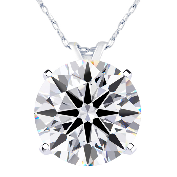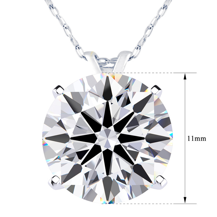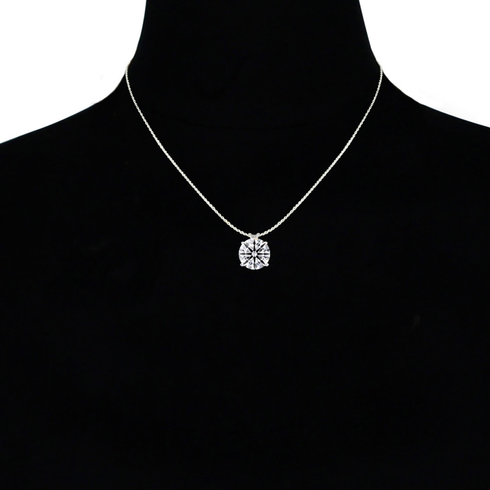 This lab grown diamond necklace features a 5 carat round shape center lab grown diamond in G-H color, VS clarity. This necklace is in 14 karat white gold and comes with an 18 inch cable chain with a spring-ring clasp.