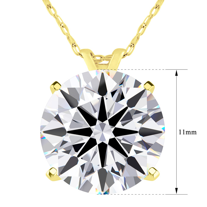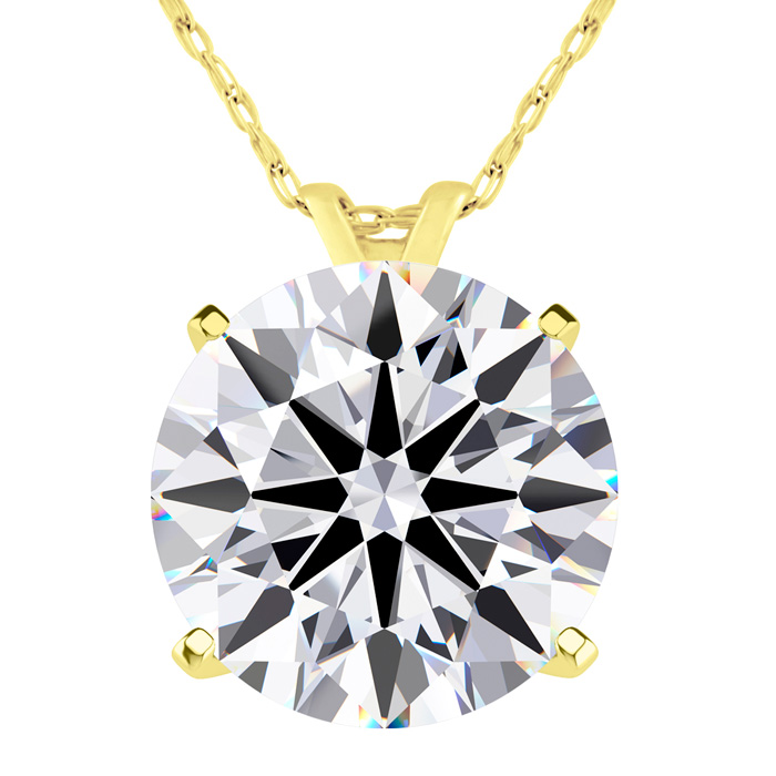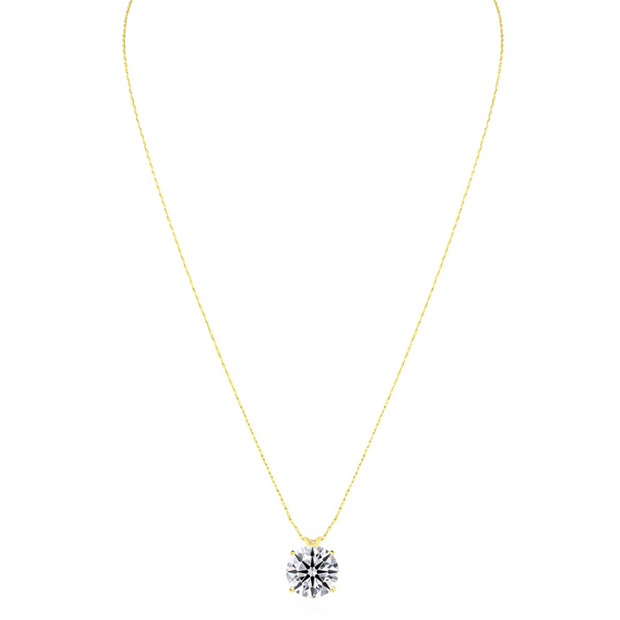 This lab grown diamond necklace features a 5 carat round shape center lab grown diamond in G-H color, VS clarity. This necklace is in 14 karat yellow gold and comes with an 18 inch cable chain with a spring-ring clasp.