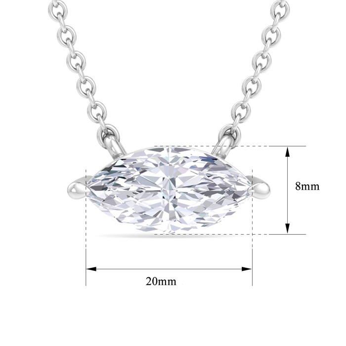 This lab grown diamond necklace features one marquise shape lab grown diamond in G-H color, VS2 clarity weighing approximately 7 carats. This necklace is in 14 karat white gold and has an 18 inch cable chain with a spring-ring clasp.