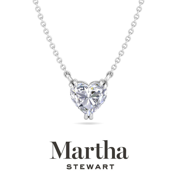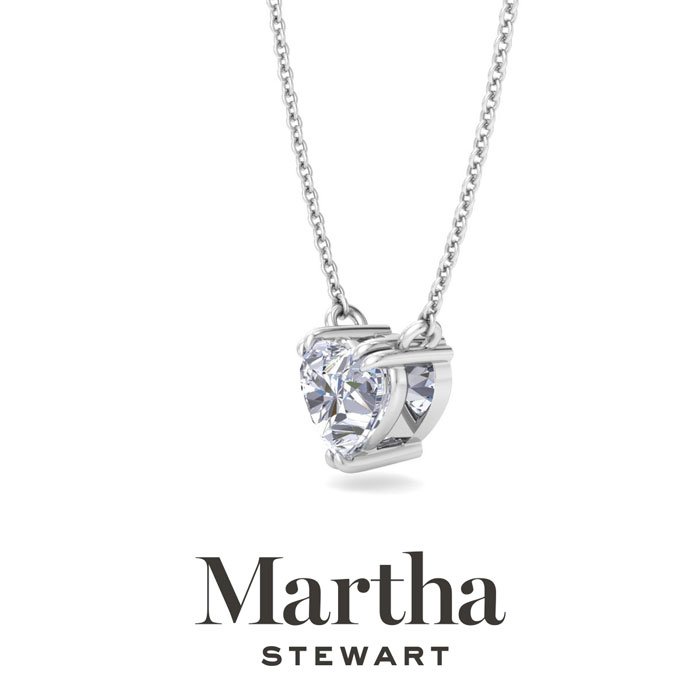 Showcasing class, style and timeless sophistication, the Martha Stewart fine jewelry collection is here to be celebrated. This Martha Stewart lab grown diamond necklace features a 1 carat heart shape center lab grown diamond in G-H color, VS clarity. This necklace is in 14 karat white gold and has a double-prong setting. The chain is 17 inches long with options to wear at 15 and 16 inches. There is a secure lobster-claw clasp and this necklace has a patent pending mirrored setting which increases the primary diamond's brilliance and beauty. Whether worn for a special occasion or to add a touch of elegance to daily wear, this necklace is sure to become a treasured heirloom. Martha Stewart’s unwavering attention to detail and dedication to quality are evident in every piece, making this collection a celebration of timeless beauty and exceptional craftsmanship.