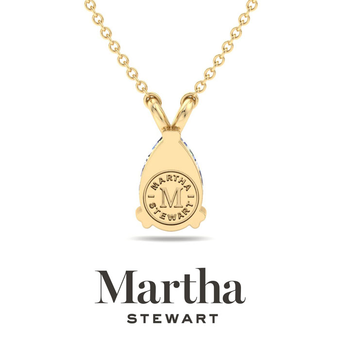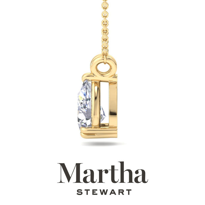 Showcasing class, style and timeless sophistication, the Martha Stewart fine jewelry collection is here to be celebrated. This Martha Stewart lab grown diamond necklace features a 1 carat pear shape center lab grown diamond in G-H color, VS clarity. This necklace is in 14 karat yellow gold and has a double-prong setting. The chain is 17 inches long with options to wear at 15 and 16 inches. There is a secure lobster-claw clasp and this necklace has a patent pending mirrored setting which increases the primary diamond's brilliance and beauty. Whether worn for a special occasion or to add a touch of elegance to daily wear, this necklace is sure to become a treasured heirloom. Martha Stewart’s unwavering attention to detail and dedication to quality are evident in every piece, making this collection a celebration of timeless beauty and exceptional craftsmanship.
