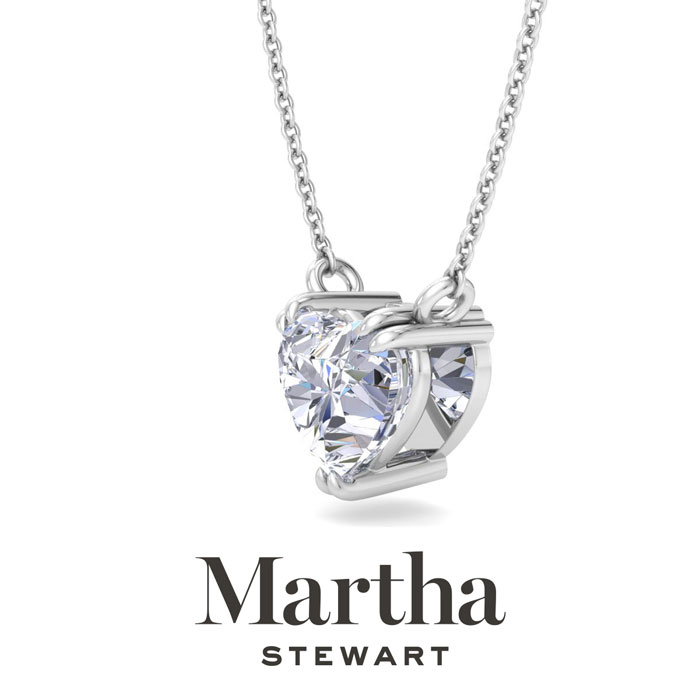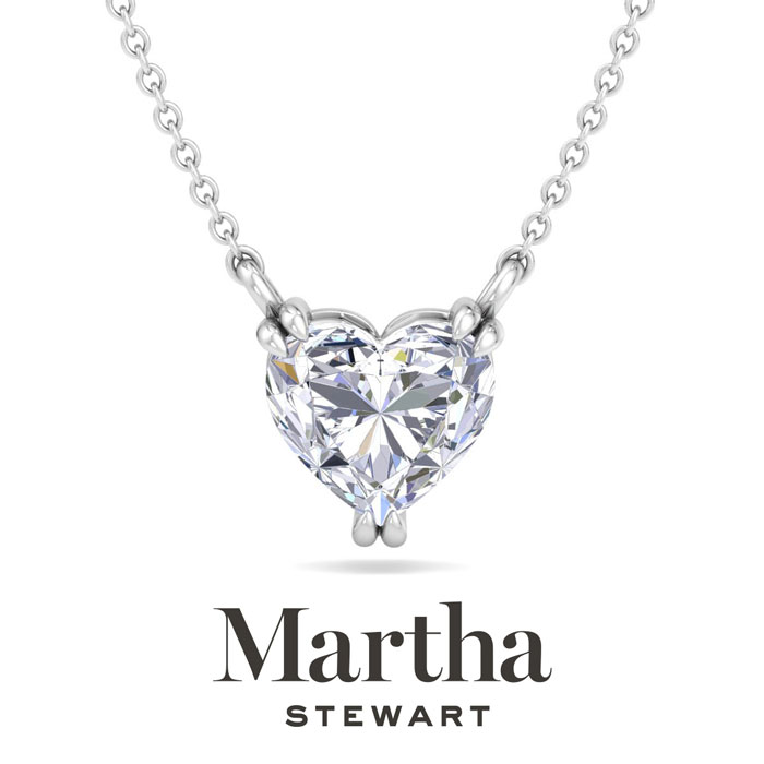 Showcasing class, style and timeless sophistication, the Martha Stewart fine jewelry collection is here to be celebrated. This Martha Stewart lab grown diamond necklace features a 3 carat heart shape center lab grown diamond in G-H color, VS clarity. This necklace is in 14 karat white gold and has a double-prong setting. The chain is 17 inches long with options to wear at 15 and 16 inches. There is a secure lobster-claw clasp and this necklace has a patent pending mirrored setting which increases the primary diamond's brilliance and beauty. Whether worn for a special occasion or to add a touch of elegance to daily wear, this necklace is sure to become a treasured heirloom. Martha Stewart’s unwavering attention to detail and dedication to quality are evident in every piece, making this collection a celebration of timeless beauty and exceptional craftsmanship.