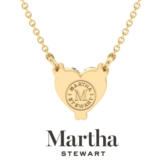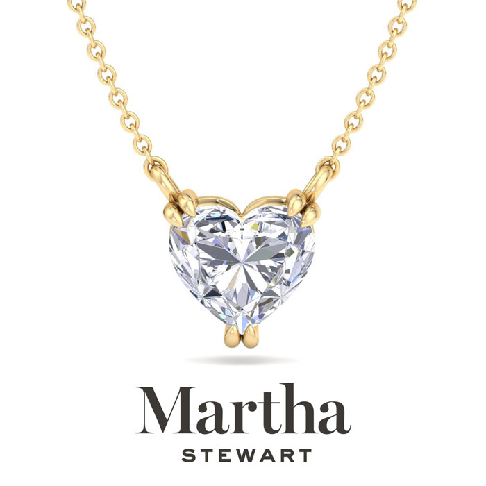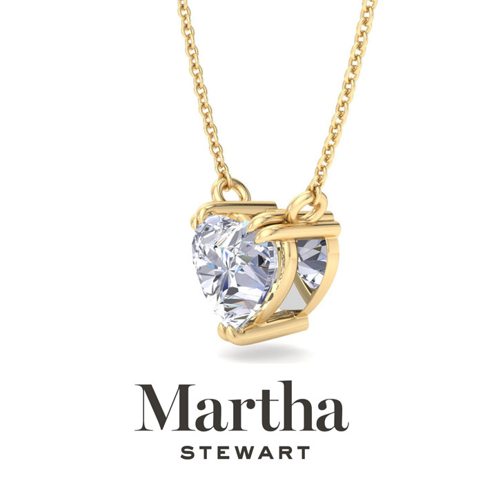 Showcasing class, style and timeless sophistication, the Martha Stewart fine jewelry collection is here to be celebrated. This Martha Stewart lab grown diamond necklace features a 3 carat heart shape center lab grown diamond in G-H color, VS clarity. This necklace is in 14 karat yellow gold and has a double-prong setting. The chain is 17 inches long with options to wear at 15 and 16 inches. There is a secure lobster-claw clasp and this necklace has a patent pending mirrored setting which increases the primary diamond's brilliance and beauty. Whether worn for a special occasion or to add a touch of elegance to daily wear, this necklace is sure to become a treasured heirloom. Martha Stewart’s unwavering attention to detail and dedication to quality are evident in every piece, making this collection a celebration of timeless beauty and exceptional craftsmanship.