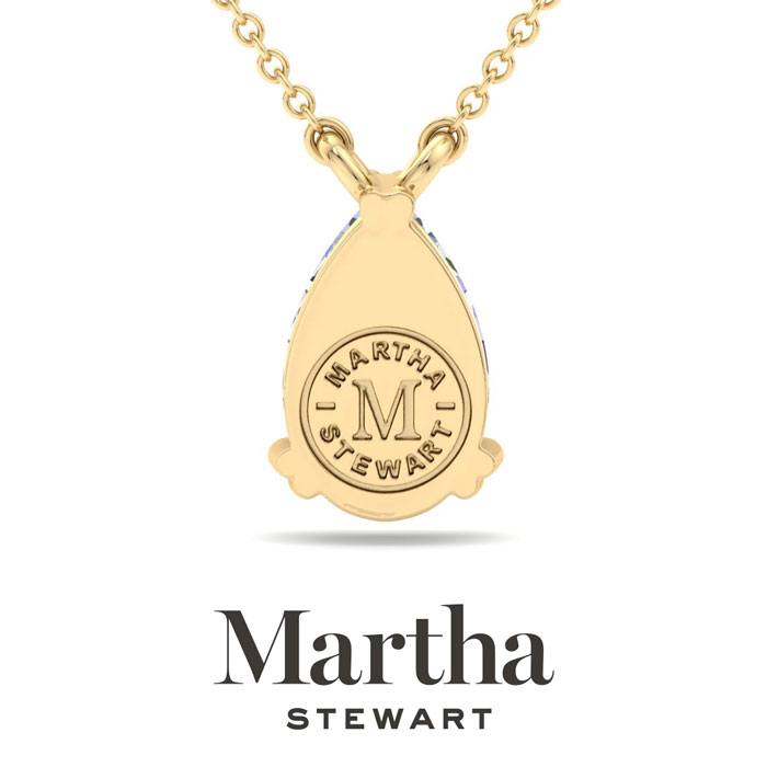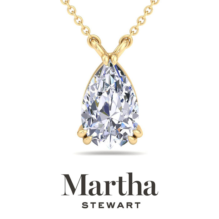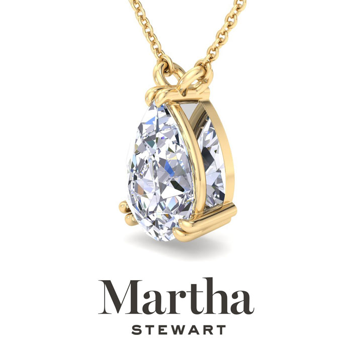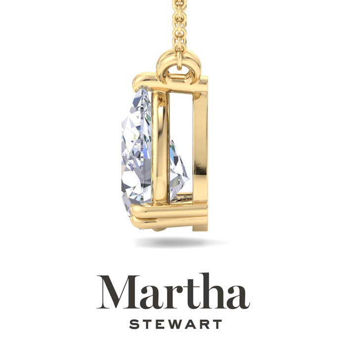 Showcasing class, style and timeless sophistication, the Martha Stewart fine jewelry collection is here to be celebrated. This Martha Stewart lab grown diamond necklace features a 3 carat pear shape center lab grown diamond in G-H color, VS clarity. This necklace is in 14 karat yellow gold and has a double-prong setting. The chain is 17 inches long with options to wear at 15 and 16 inches. There is a secure lobster-claw clasp and this necklace has a patent pending mirrored setting which increases the primary diamond's brilliance and beauty. Whether worn for a special occasion or to add a touch of elegance to daily wear, this necklace is sure to become a treasured heirloom. Martha Stewart’s unwavering attention to detail and dedication to quality are evident in every piece, making this collection a celebration of timeless beauty and exceptional craftsmanship.