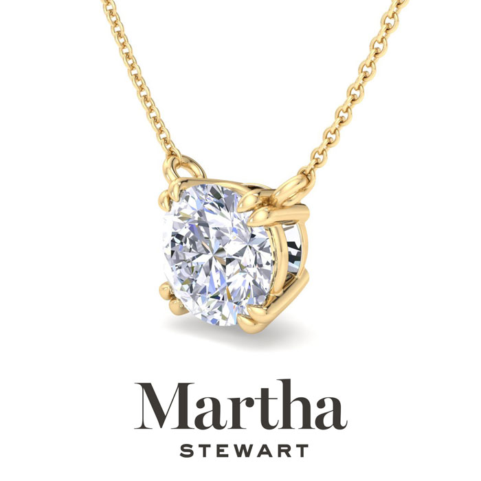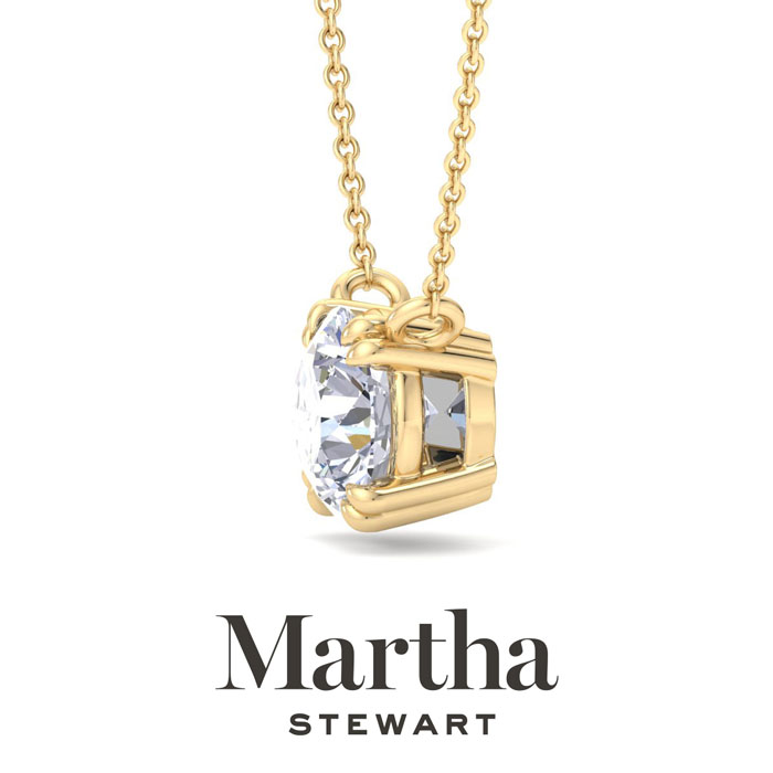 Showcasing class, style and timeless sophistication, the Martha Stewart fine jewelry collection is here to be celebrated. This Martha Stewart lab grown diamond necklace features a 3 carat round shape center lab grown diamond in G-H color, VS clarity. This necklace is in 14 karat yellow gold and has a double-prong setting. The chain is 17 inches long with options to wear at 15 and 16 inches. There is a secure lobster-claw clasp and this necklace has a patent pending mirrored setting which increases the primary diamond's brilliance and beauty. Whether worn for a special occasion or to add a touch of elegance to daily wear, this necklace is sure to become a treasured heirloom. Martha Stewart’s unwavering attention to detail and dedication to quality are evident in every piece, making this collection a celebration of timeless beauty and exceptional craftsmanship.