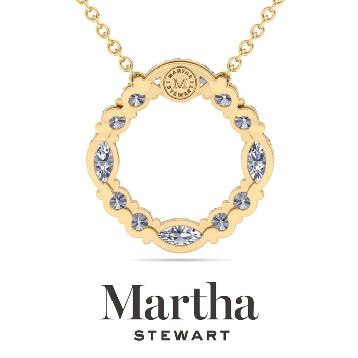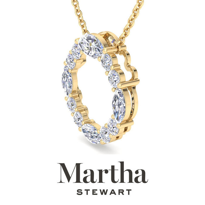 Showcasing class, style and timeless sophistication, the Martha Stewart fine jewelry collection is here to be celebrated. This Martha Stewart lab grown diamond necklace features 12 round and marquise shape lab grown diamonds including a 1 carat lab grown diamond in G-H color, VS clarity totaling 4 carats. This necklace is in 14 karat yellow gold. The chain is 17 inches long with options to wear at 15 and 16 inches. There is a secure lobster-claw clasp and is 1 inch in diameter. Whether worn for a special occasion or to add a touch of elegance to daily wear, this necklace is sure to become a treasured heirloom. Martha Stewart’s unwavering attention to detail and dedication to quality are evident in every piece, making this collection a celebration of timeless beauty and exceptional craftsmanship.