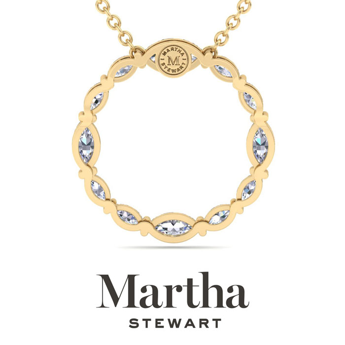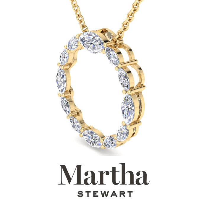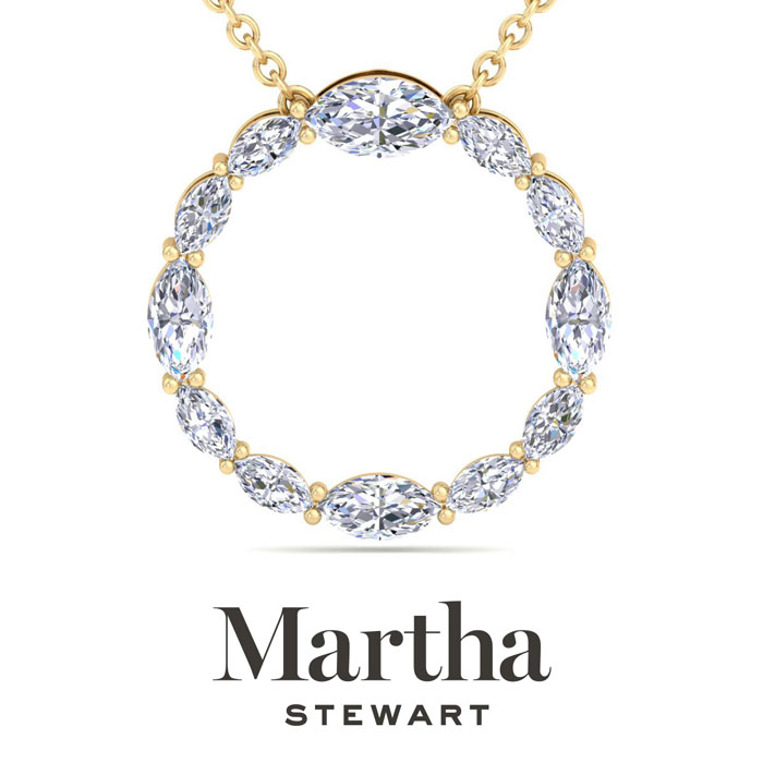 Showcasing class, style and timeless sophistication, the Martha Stewart fine jewelry collection is here to be celebrated. This Martha Stewart lab grown diamond necklace features 12 marquise shape lab grown diamonds including a 1 carat lab grown diamond in G-H color, VS clarity totaling 4 carats. This necklace is in 14 karat yellow gold. The chain is 17 inches long with options to wear at 15 and 16 inches. There is a secure lobster-claw clasp and is 1 1/4 inches in diameter. Whether worn for a special occasion or to add a touch of elegance to daily wear, this necklace is sure to become a treasured heirloom. Martha Stewart’s unwavering attention to detail and dedication to quality are evident in every piece, making this collection a celebration of timeless beauty and exceptional craftsmanship.