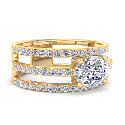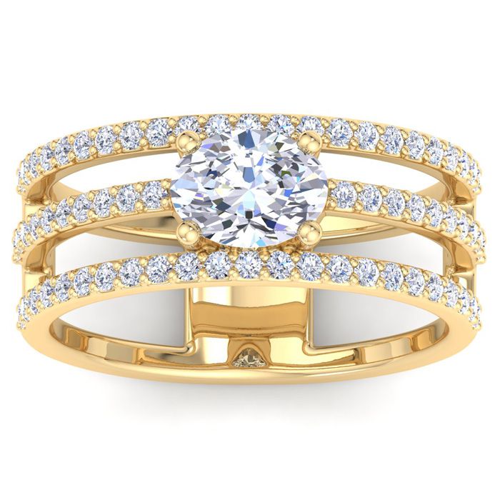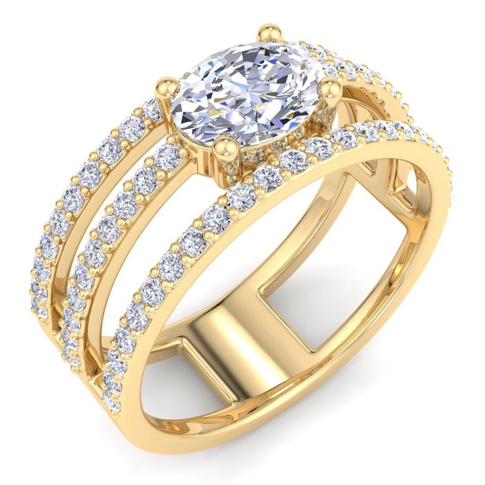 This lab grown diamond ring features 66 round shape lab grown diamonds and 1 oval shape center lab grown diamond at approximately 1 1/2 carat total weight. Diamond color is G-H color, VS clarity. Ring is 1/2 inch wide and is in 14 karat yellow gold.