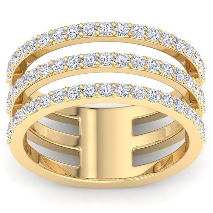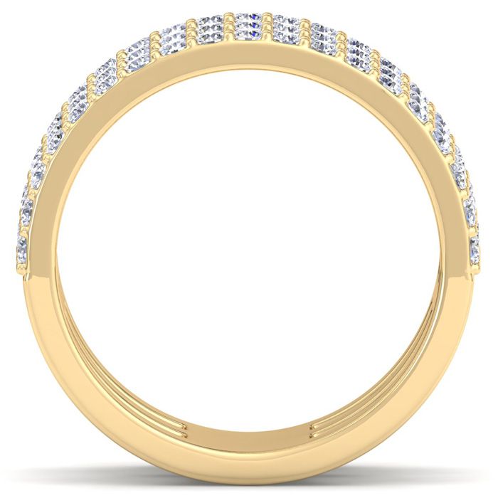 This lab grown diamond ring features 57 round shape lab grown diamonds at approximately 1 carat total weight. Diamond color is G-H color, VS clarity. Ring is 1/2 inch wide and is in 14 karat yellow gold.
