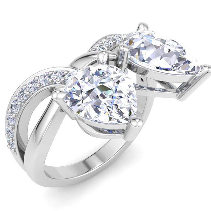 This two stone engagement ring features one 1 3/4 carat pear shape lab grown diamond and one 1 1/2 carat pear shape lab grown diamond in G-H color, VS clarity. They are accented with 19 side lab grown diamonds. Total carat weight is approximately 3 1/2 carats. This ring is in 14 karat white gold.