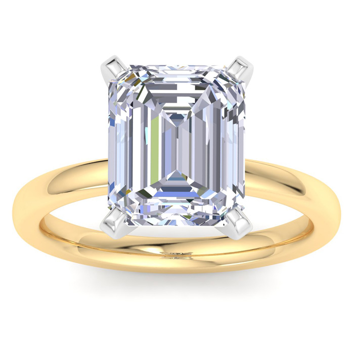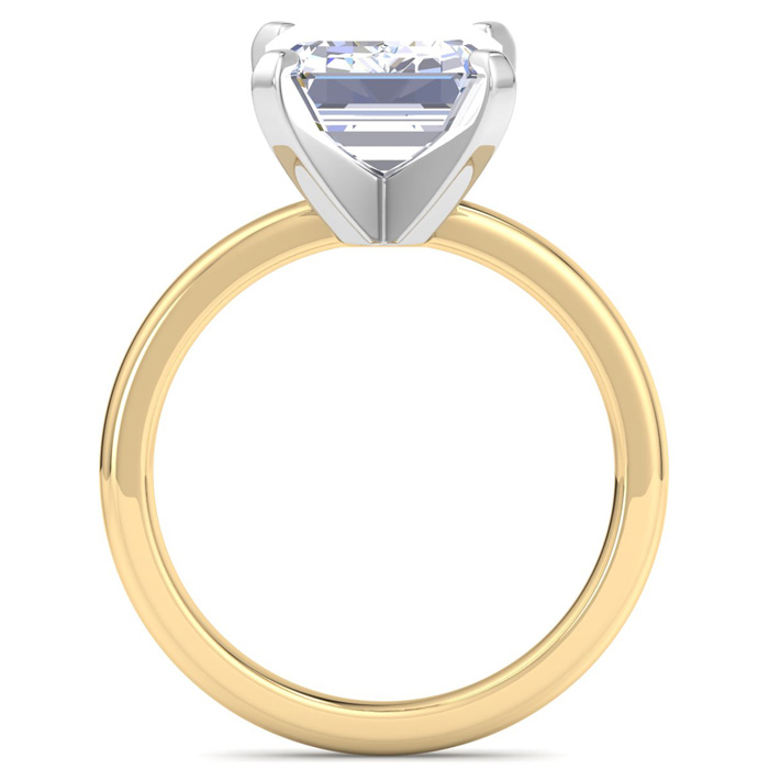 This lab grown diamond ring features a 5 carat emerald cut center lab grown diamond in G-H color, VS clarity. This ring is in 14 karat yellow gold.