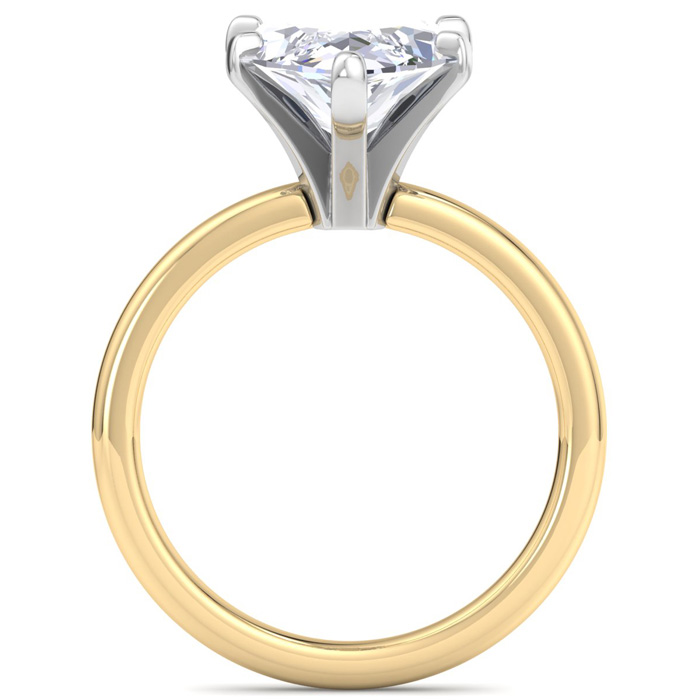 This lab grown diamond ring features a 5 carat marquise shape center lab grown diamond in G-H color, VS clarity. This ring is in 14 karat yellow gold.