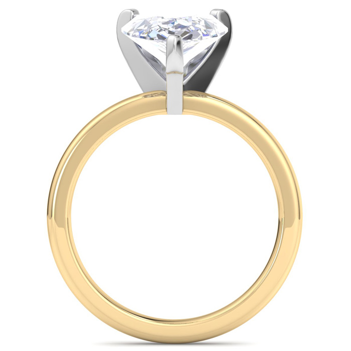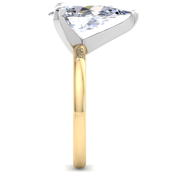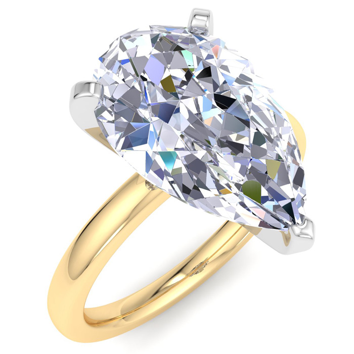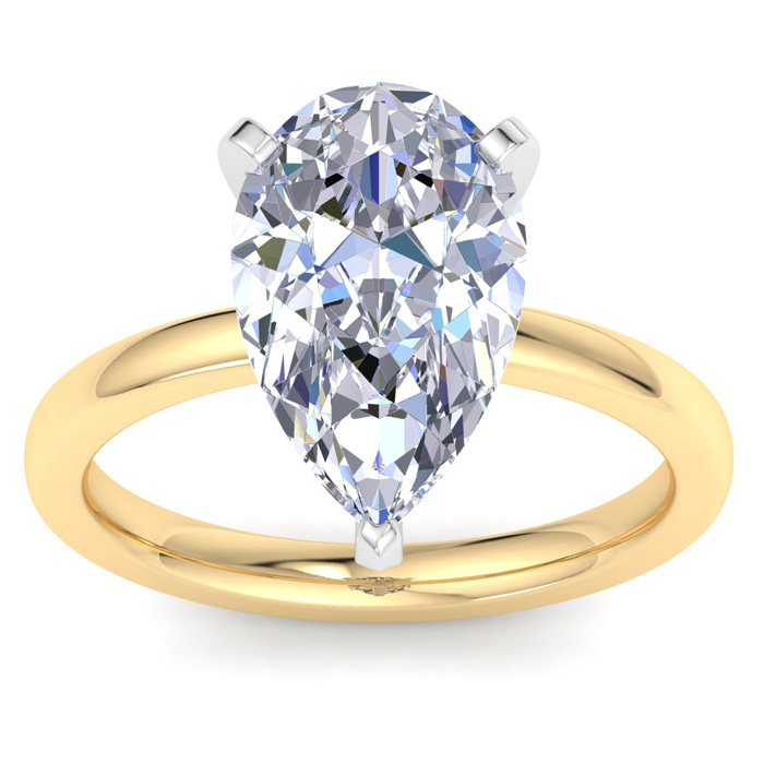 This lab grown diamond ring features a 5 carat pear shape center lab grown diamond in G-H color, VS clarity. This ring is in 14 karat yellow gold.