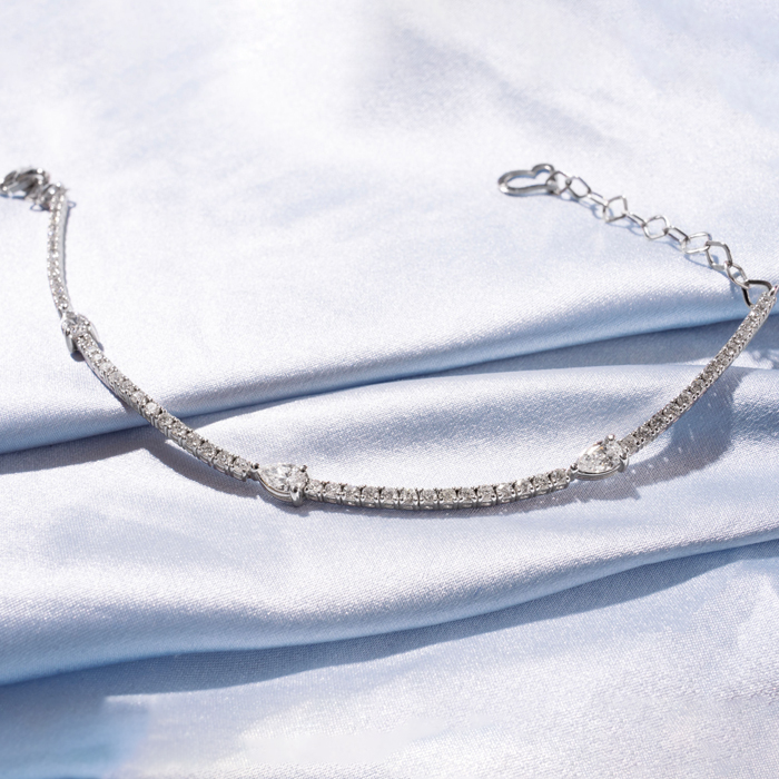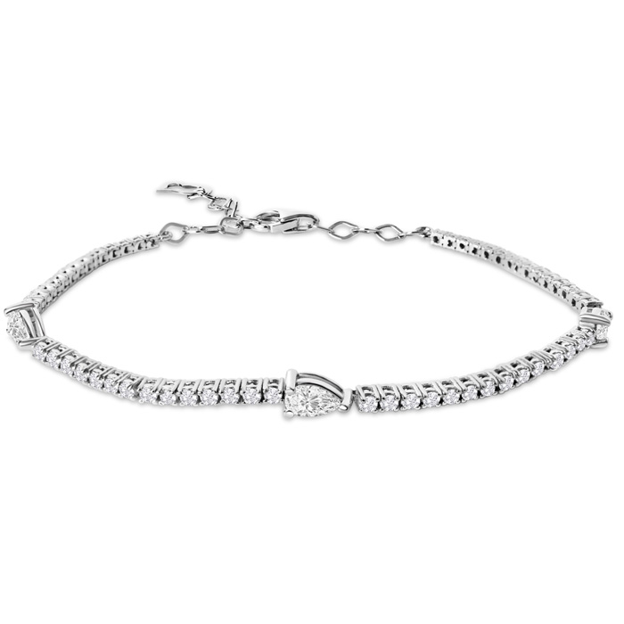This lab grown diamond tennis bracelet is set in 14 karat white gold. This bracelet features 3-5x3mm pear shape lab grown diamonds, each weighing approximately 0.40 carats. There are 56 round shape lab grown diamonds. Total carat weight is 1 1/3 carats. Lab grown diamond color is G-H, diamond clarity is VS. This bracelet has a lobster claw clasp and is 7 inches long.