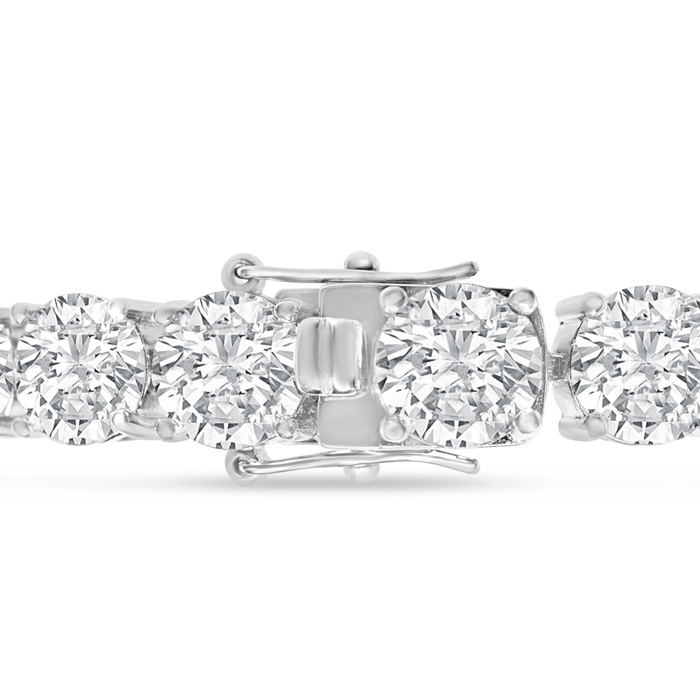 This lab grown diamond tennis bracelet is set in 14 karat white gold. A secure, hidden-safety clasp keeps this piece fastened. Lab grown diamond color is G-H, diamond clarity is VS. There are 26 lab grown diamonds totaling 32 carats. Each lab grown diamond weighs 1 1/4 carats.