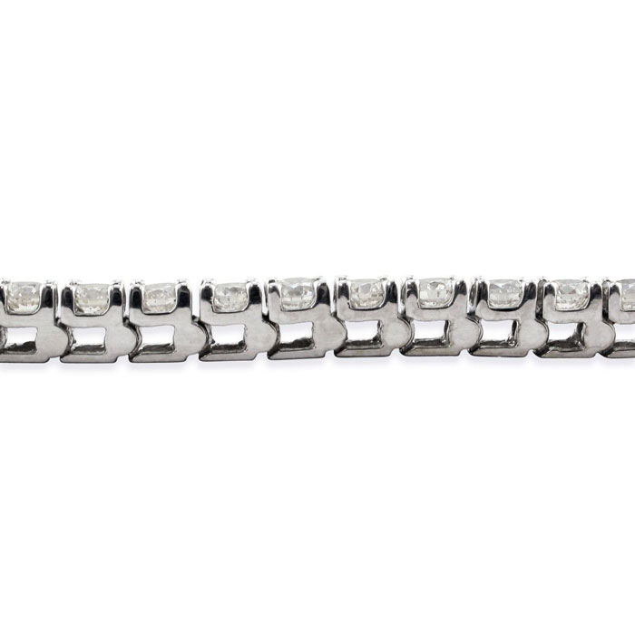This lab grown diamond tennis bracelet is set in 14 karat white gold. A secure, hidden-safety clasp keeps this piece fastened. Lab grown diamond color is G-H, diamond clarity is VS. Total carat weight and stone counts per option are as follows: 6 inch-46 lab grown diamonds, 4 1/2 carats; 6.5 inch-50 lab grown diamonds, 4 3/4 carats; 7 inch-54 lab grown diamonds, 5 carats; 7 1/2 inch-58 lab grown diamonds, 5 1/2 carats; 8 inch-62 lab grown diamonds, 5 3/4 carats; 8 1/2 inches-66 lab grown diamonds, 6 carats; 9 inch-70 lab grown diamonds, 6 1/2 carats.