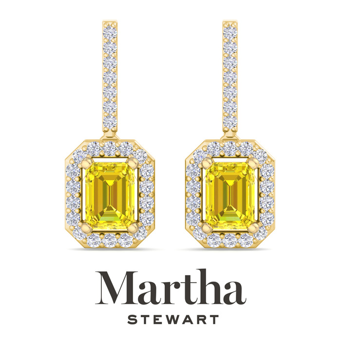 Showcasing class, style and timeless sophistication, the Martha Stewart fine jewelry collection is here to be celebrated. These Martha Stewart lab grown diamond earrings feature 50 round shape lab grown diamonds in G-H color, VS clarity and two 1 carat emerald cut fancy yellow lab grown diamonds. Total carat weight is 2 1/2 carats. These earrings are in 14 karat yellow gold and have post with screw backs. These earrings dangle down 1 inch! Whether worn for a special event or to enhance everyday elegance, these earrings are sure to become cherished heirlooms. Martha Stewart’s attention to detail and dedication to quality shine through in every piece, making this collection a celebration of refined craftsmanship and timeless beauty.
