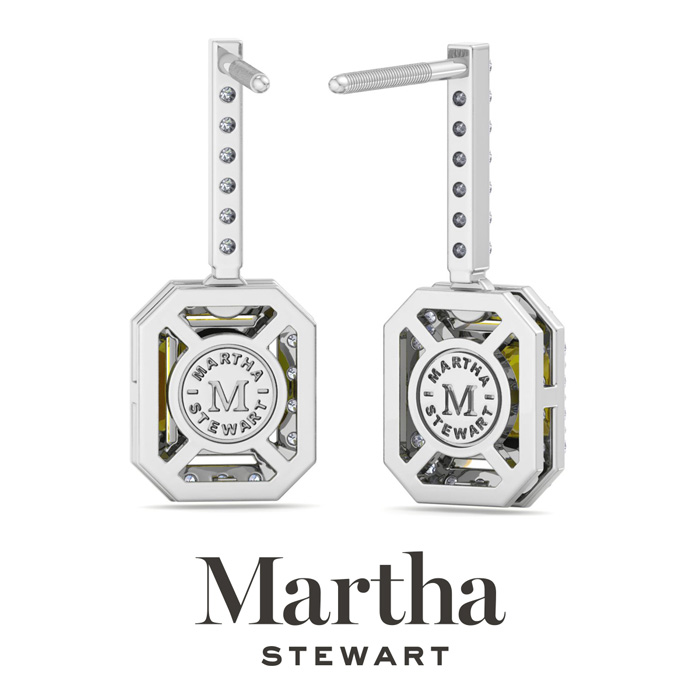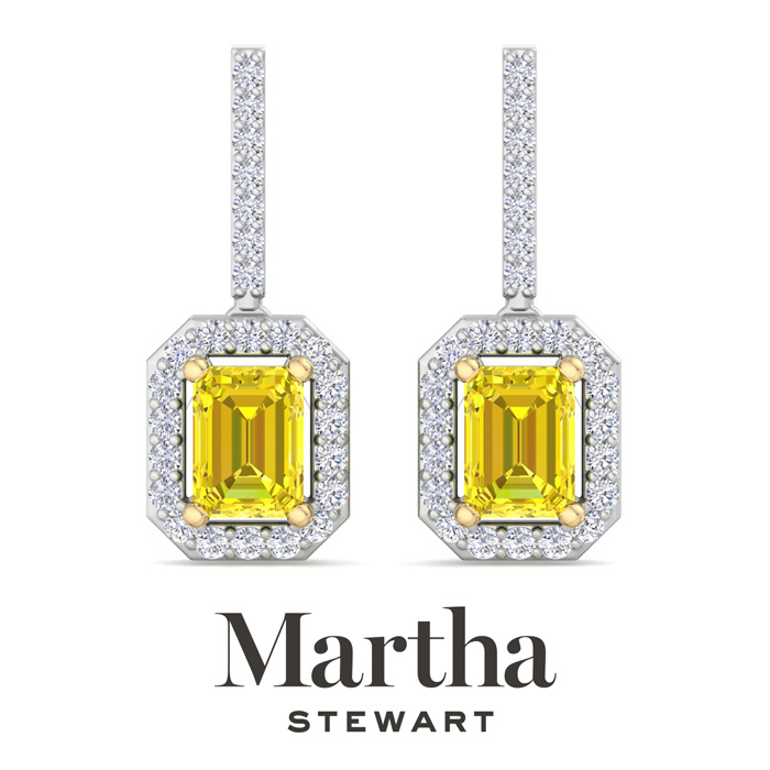 Showcasing class, style and timeless sophistication, the Martha Stewart fine jewelry collection is here to be celebrated. These Martha Stewart lab grown diamond earrings feature 50 round shape lab grown diamonds in G-H color, VS clarity and two 1 carat emerald cut fancy yellow lab grown diamonds. Total carat weight is 2 1/2 carats. These earrings are in Sterling Silver and have post with screw backs. These earrings dangle down 1 inch! Whether worn for a special event or to enhance everyday elegance, these earrings are sure to become cherished heirlooms. Martha Stewart’s attention to detail and dedication to quality shine through in every piece, making this collection a celebration of refined craftsmanship and timeless beauty.