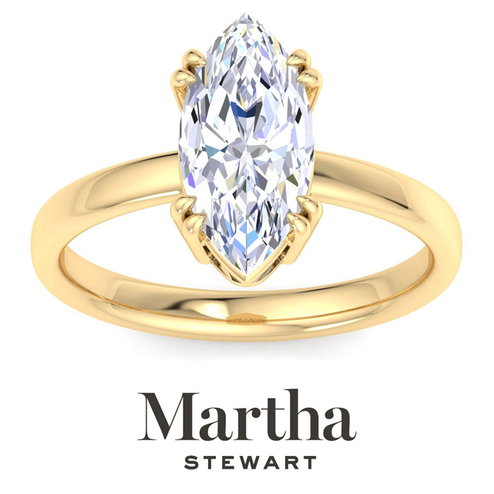 Showcasing class, style and timeless sophistication, the Martha Stewart fine jewelry collection is here to be celebrated. This Martha Stewart lab grown diamond ring features a 2 carat marquise shape center lab grown diamond in G-H color, VS clarity. This ring is in 14 karat yellow gold. This Martha Stewart ring has a double prong setting and is comfort fit for a luxurious feel on your finger. This ring also has a patent pending mirrored setting which increases the primary diamond's brilliance and beauty. Whether for a special occasion or to add a touch of elegance to everyday wear, this ring is sure to become a beloved heirloom. Martha Stewart’s dedication to quality and attention to detail are reflected in every piece, making this collection a celebration of timeless beauty and exceptional craftsmanship.