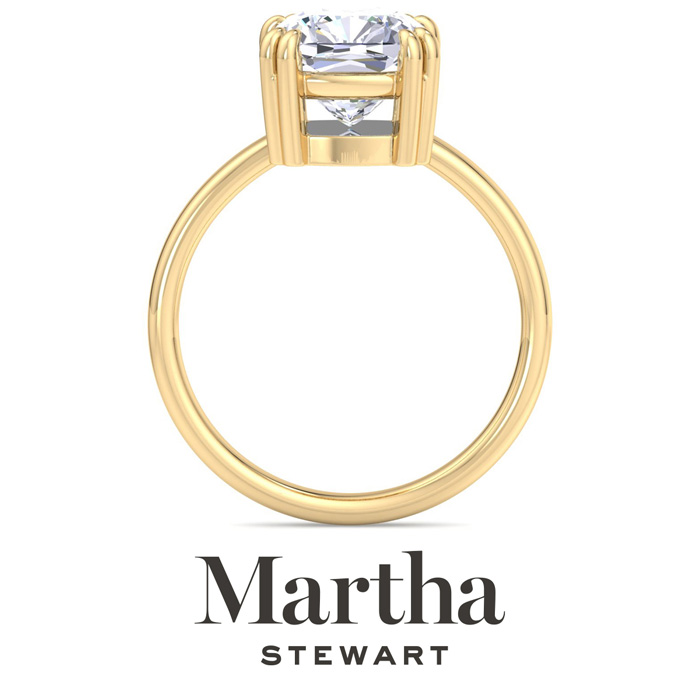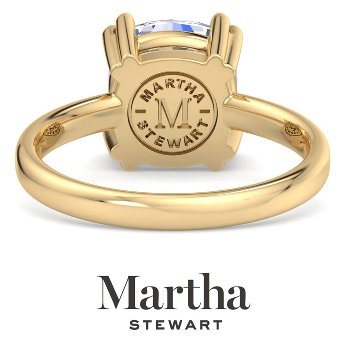 Showcasing class, style and timeless sophistication, the Martha Stewart fine jewelry collection is here to be celebrated. This Martha Stewart lab grown diamond ring features a 3 carat cushion cut center lab grown diamond in G-H color, VS clarity. This ring is in 14 karat yellow gold. This Martha Stewart ring has a double prong setting and is comfort fit for a luxurious feel on your finger. This ring also has a patent pending mirrored setting which increases the primary diamond's brilliance and beauty. Whether for a special occasion or to add a touch of elegance to everyday wear, this ring is sure to become a beloved heirloom. Martha Stewart’s dedication to quality and attention to detail are reflected in every piece, making this collection a celebration of timeless beauty and exceptional craftsmanship.