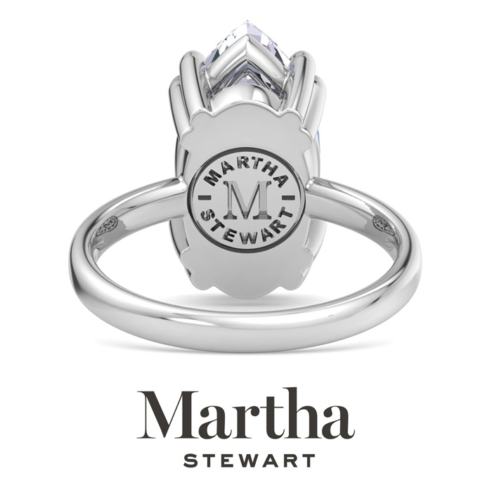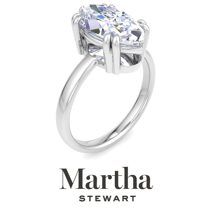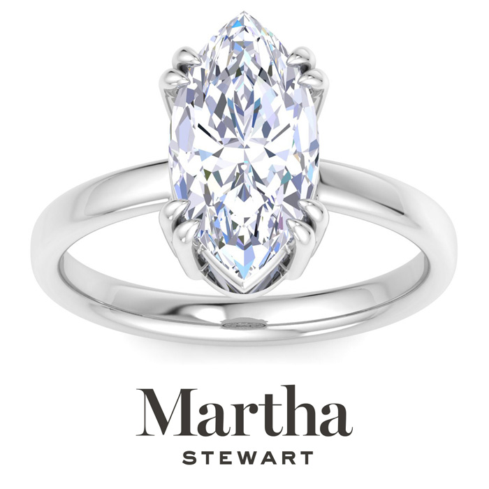 Showcasing class, style and timeless sophistication, the Martha Stewart fine jewelry collection is here to be celebrated. This Martha Stewart lab grown diamond ring features a 3 carat marquise shape center lab grown diamond in G-H color, VS clarity. This ring is in 14 karat white gold. This Martha Stewart ring has a double prong setting and is comfort fit for a luxurious feel on your finger. This ring also has a patent pending mirrored setting which increases the primary diamond's brilliance and beauty. Whether for a special occasion or to add a touch of elegance to everyday wear, this ring is sure to become a beloved heirloom. Martha Stewart’s dedication to quality and attention to detail are reflected in every piece, making this collection a celebration of timeless beauty and exceptional craftsmanship.