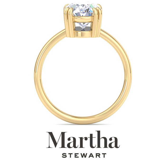Showcasing class, style and timeless sophistication, the Martha Stewart fine jewelry collection is here to be celebrated. This Martha Stewart lab grown diamond ring features a 3 carat oval shape center lab grown diamond in G-H color, VS clarity. This ring is in 14 karat yellow gold. This Martha Stewart ring has a double prong setting and is comfort fit for a luxurious feel on your finger. This ring also has a patent pending mirrored setting which increases the primary diamond's brilliance and beauty. Whether for a special occasion or to add a touch of elegance to everyday wear, this ring is sure to become a beloved heirloom. Martha Stewart’s dedication to quality and attention to detail are reflected in every piece, making this collection a celebration of timeless beauty and exceptional craftsmanship.